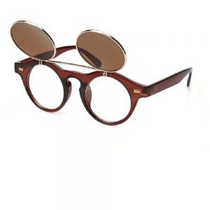 Кафяви, слънчеви очила с капаци жълт метал. Дължина на рамките: 14 сантиметра. Диаметър на стъклата: 4 сантиметра. 100% UV защита. Материал: метал, пластмаса полимери.