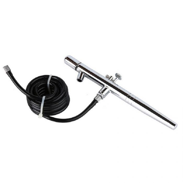 За начинаещи и напреднали. Дюза Диаметър: 0.35 милиметра. Работно налягане: 15-50 PSI. Въздушна струя: 1 метър. Размер на аерографа : 14.8 сантиметра. Дължина на маркуча: 150 сантиметра. Аерограф. Стъклен буркан с отвор за маркуч. Стъклен буркан с капак. Маркуч. Гаечен ключ. Метална чаша. Упътване.
