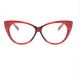 Котешки очила с червено - черна рамка и призрачни стъкла. Дължина на предна рамка: 14 сантиметра. Дължина на странична рамка: 13.3 сантиметра. Размер само за стъклата без рамките: 4.2 - 5.5 сантиметра. Разстояние за носа: 2 сантиметра.