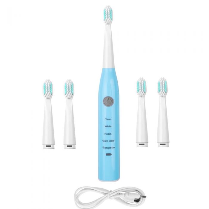 <Водоустойчива електрическа, вибрационна четка за зъби. Ultrasonic 41000 вибрации в минута. Внимателно, финно почистване на зъбите, трудно достъпни места на венците, масаж на венците. Предотвратява кървенето на венците. 5 режима на действие. С едно зареждане се извършват 60 процедури. Автоматично изключване след 2 минути. Комплекта включва: 1 брой четка, пет сменяеми глави, USB кабел за зареждане. При зареждане индикаторът свети в червено. Цвят: син. Материал: пластмаса. Режим на зареждане: 5V-USB порт към зарядно за телефон, компютър, лап топ. Напрежение: 3.7V. Мощност: 0.5W. Ултразвукова четка за зъби с 5 глави.