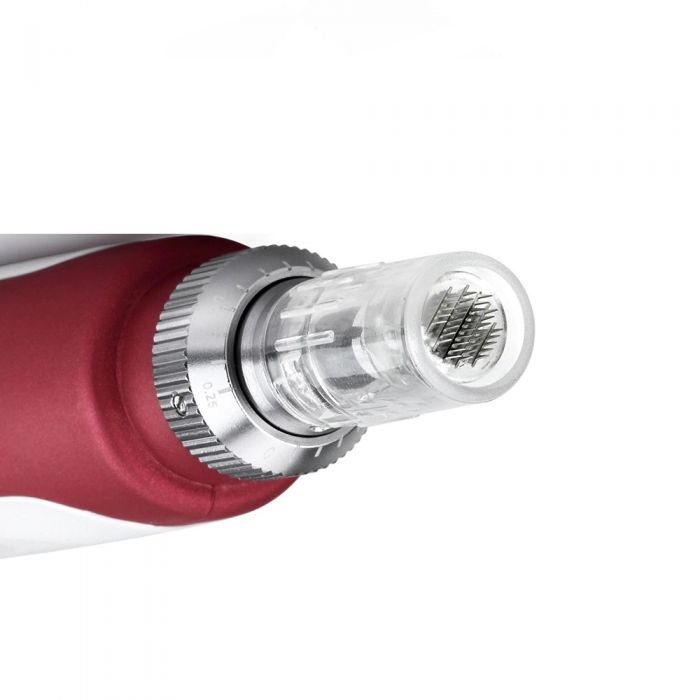 Електрически дерма пен с адаптор. Комбиниран козметичен апарат с пет скорости на работа в различна светлинна индикация за всяка скорост. Уреда предназначен за всякакъв вид кожа. За работа с касетъчни игли тип байонет. Писалка за изработване на трайни татуировки. Писалка за изработване на перманентен грим - вежди, устни, очна линия. Писалка за мезо терапия - премахване на белези от акне, стрии, пигментни петна, малки бръчки, дълбоки бръчки, целулит, борба с косопад. Микро иглена терапия за подмладяване на кожата - премахване на мъртва кожа, ексфолиране на петна. Уреда стимулира регенерацията на колаген, директно усвояване на хранителните вещества, премахване на торбички под очите, свиване на порите. Регулируема дължина на иглите от 0.25 до 2.5 милиметра. Цвят: червен. Писалка, зарядно, кабел, 2 броя стерилни различни игли, 1 брой за мезо терапия и 1 брой за перманентен грим. Номинално напрежение: 100-240V AC. Входяща мощност: 5V, 500mA. Скорост: 6000 оборота в минута. Не се работи върху родилни петна, брадавици, бенки, меланоза, псориазис, витилиго. Уреда се продава в луксозна кутия. За домашна и професионална употреба.