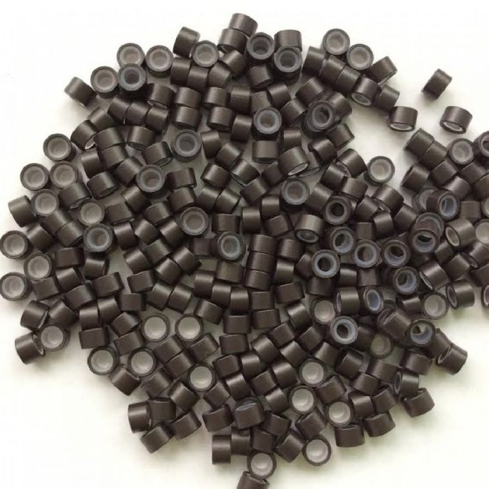 Екстешън пръстени за коса със силикон тъмно кафяви. Материал: алуминий и силикон за предпазване на косъма от увреждания. Размер на отвора: 3.5 милиметра. Цена за: 100 броя.