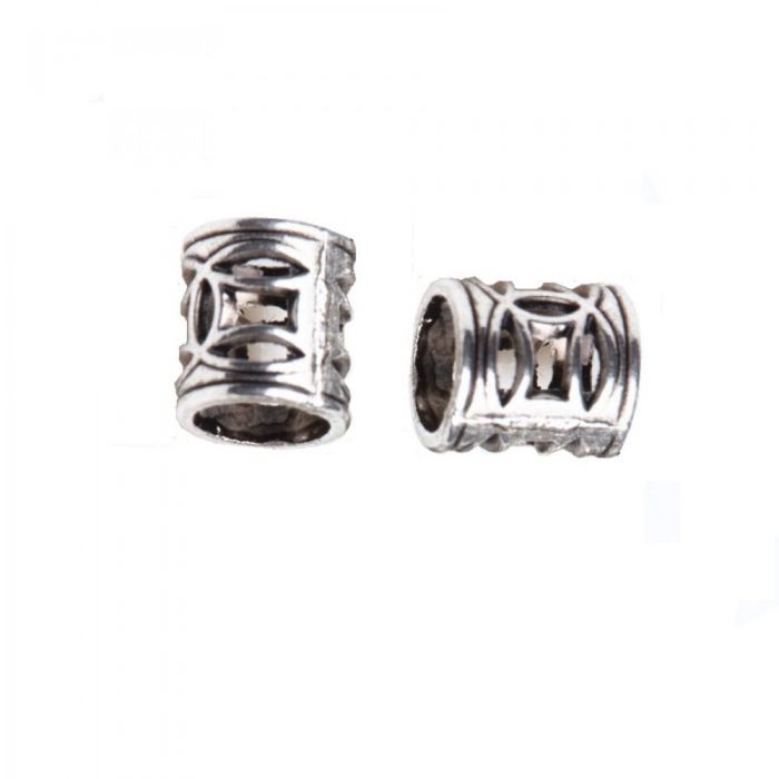 Релефни цилиндри, украшение за плитки коса - имитация на сребро. Цвят: бял. Цена за: 10 броя. Диаметър: 6 милиметра. Дължина: 7 милиметра. Метални цилиндри.