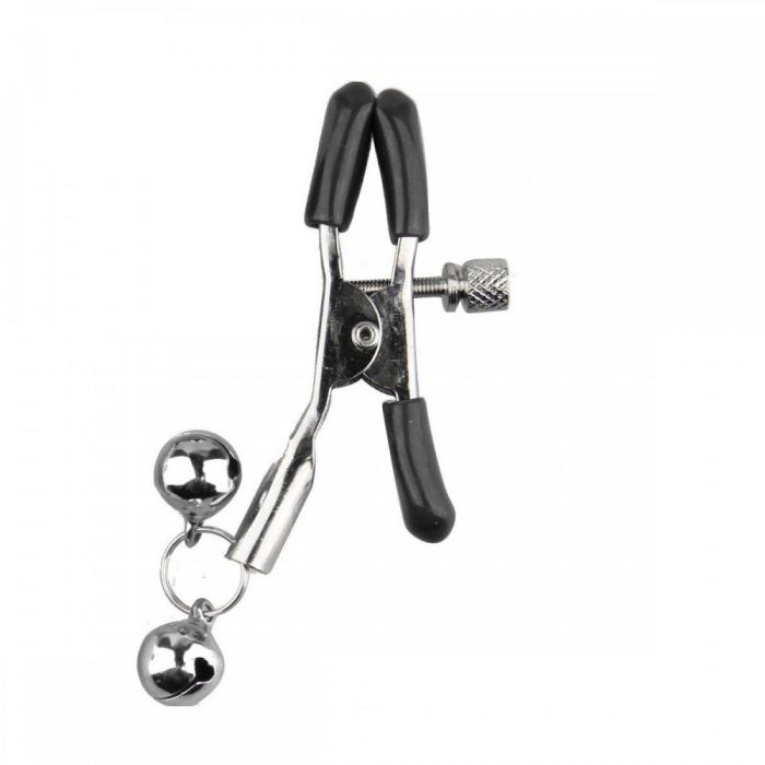 Клипове за зърно със звънчета. Фетиш обица със защипване. Въртящ се ограничител със силиконови предпазители против прищипване на зърното. Материал: алуминий + силикон. Обица без пробиване. Цвят: черен + сребърен за звънчетата. Размер: 2.2 - 6 сантиметра. Цена за: 1 брой.