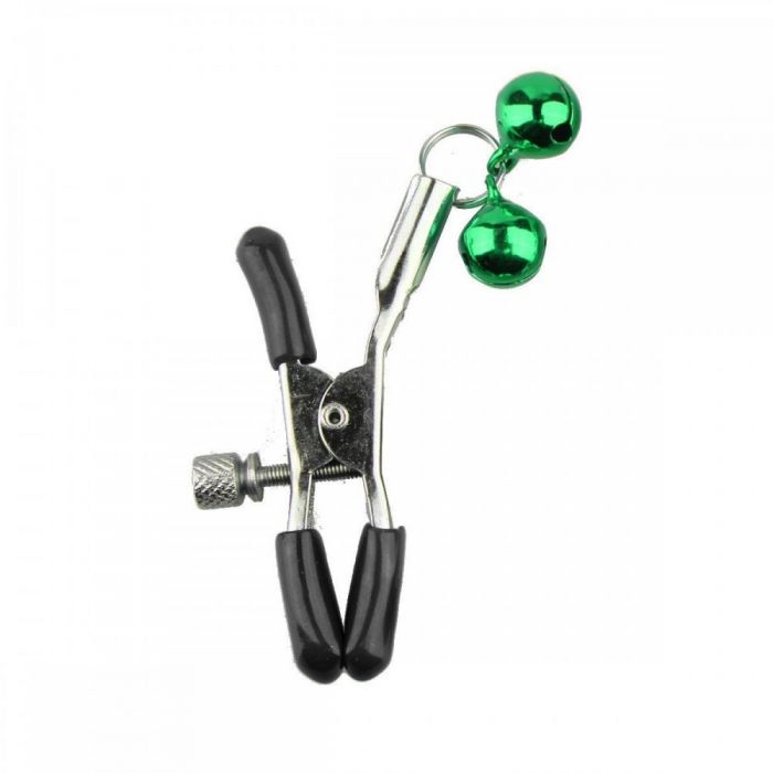 Клипове за зърно със звънчета. Фетиш обица със защипване. Въртящ се ограничител със силиконови предпазители против прищипване на зърното. Материал: алуминий + силикон. Обица без пробиване. Цвят: черен + зелен за звънчетата. Размер: 2.2 - 6 сантиметра. Цена за: 1 брой.