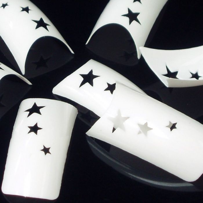 Пластмасови удължители за върха на нокътя, поставят се с помощта на лепило, гел, акрил или акригел. Подходящи за професионална и домашна употреба. 100 броя в комплект от 10 размера. Бели на цвят, имат релеф 3 звездички.
