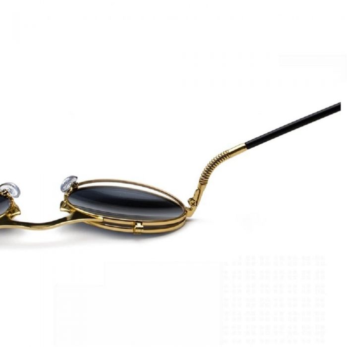 Черни слънчеви очила, пружиниращи рамки с капаци. Дължина на рамките: 12.5 - 13.2 сантиметра. Диаметър на стъклата: 5 сантиметра. 100% UV защита. Материал: метал, полимери.