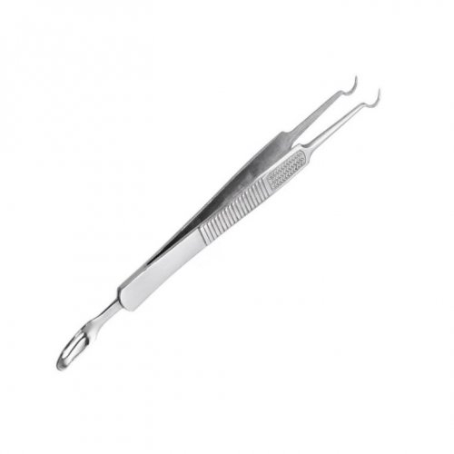 Пинцет за почистване на акне, черни точки и комедони. В единия край има метално уше за комедони, а в другия има остри и закривени крайща. Изработен от медицинска стомана. Размер: 9.7 сантиметра. Тегло: 6.4 грама. Цвят: сребърен.