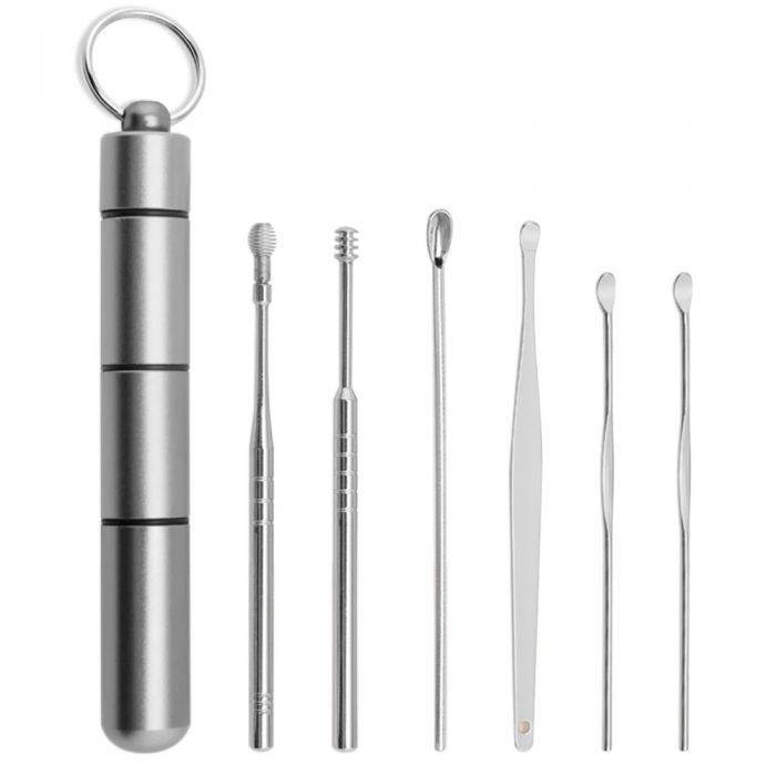 Сет от инструменти за почистване на уши, персонален комплект в метална капсула. 6 броя инструменти. Материал: медицинска стомана. Капсулата се развива на повече от едно място. Размер на кутията: 12.5 сантиметра.