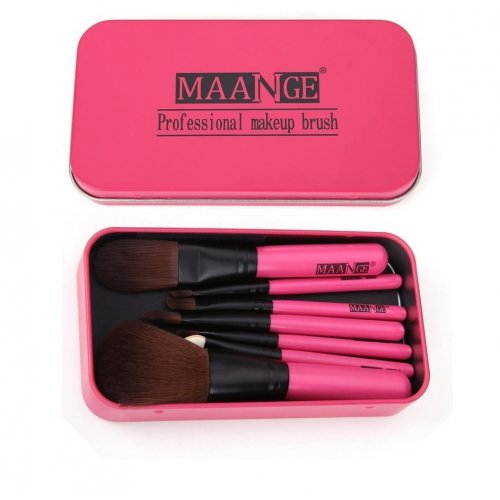 Професионални четки за грим в метална кутия. В комплекта са 7 броя различни четки за грим, подходящи за основните техники. Четките са с дъревена дръжка в розово, кутията е метала и също е розова. Размери на кутията: 7 - 13 сантиметра.