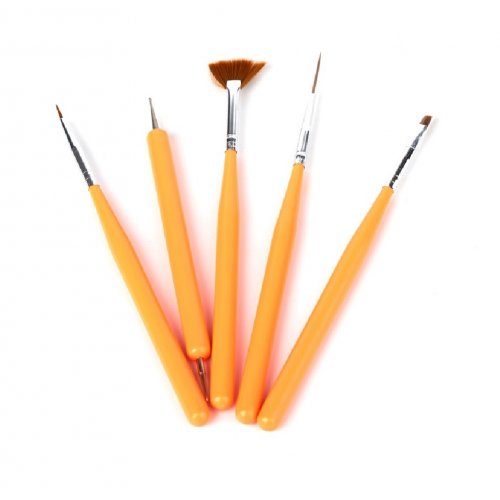 5 броя четки, с едни двустранен точкатор за декорация на маникюр. Дръжките са дървени, оранжеви на цвят, а върха е синтетичен. Дължина: 15 сантиметра.