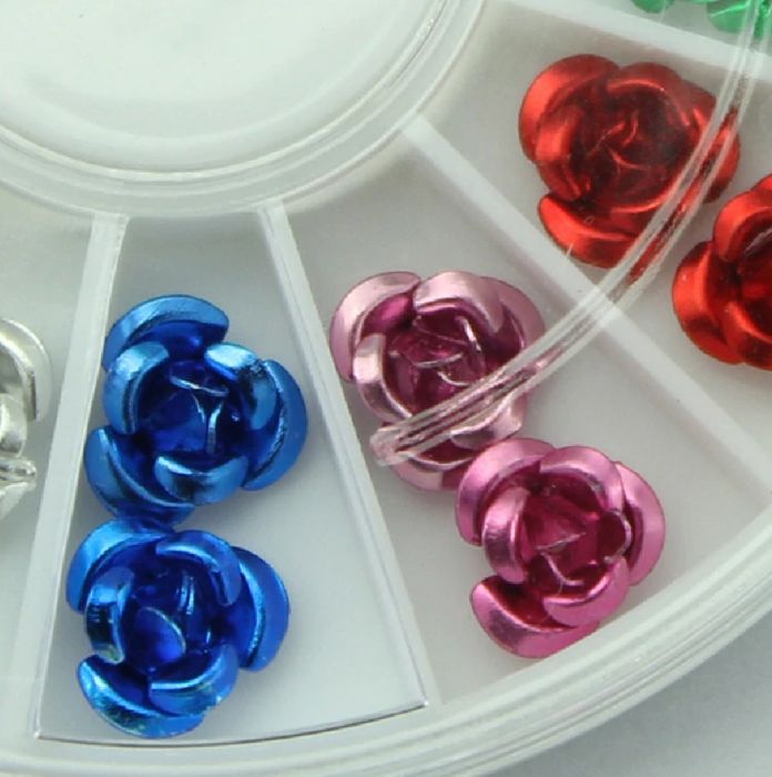Сет от метални розички за декориране на маникюр. 12 разноцветни цветенца, по 2 броя от цвят. Цената е за 1 кутийка.