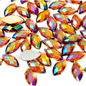 Фасетъчни камъчета за нокти във формата на ромбоид, с кехлибарен цвят. Материал: полимери. Размери: 4 - 8 милиметра. Цена за: 20 броя.