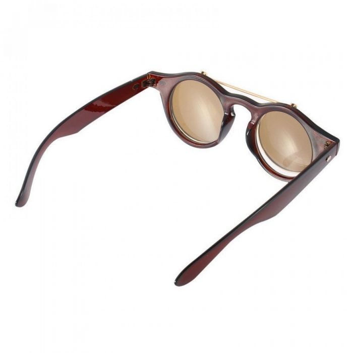 Кафяви, слънчеви очила с капаци жълт метал. Дължина на рамките: 14 сантиметра. Диаметър на стъклата: 4 сантиметра. 100% UV защита. Материал: метал, пластмаса полимери.