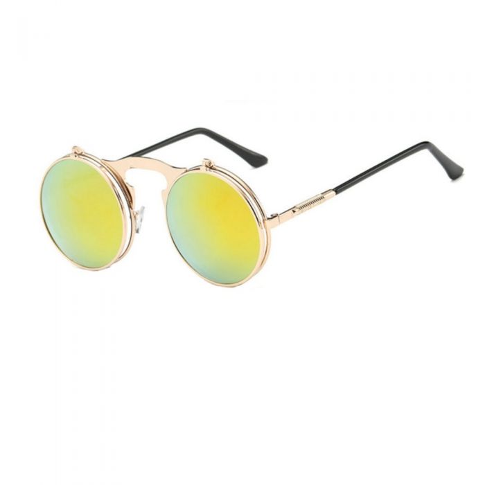 Огледални слънчеви очила, пружиниращи рамки с капаци. Дължина на рамките: 12.5 - 13.2 сантиметра. Диаметър на стъклата: 5 сантиметра. 100% UV защита. Материал: метал, полимери.