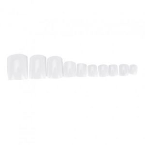 Пластмасови, изкуствени нокти за педикюр. Подходящи за професионална и домашна употреба. 100 броя в комплект от 10 размера. Цвят: бял.