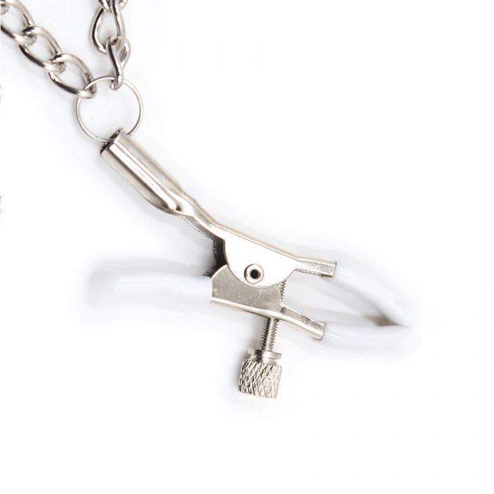 Двойна обица за поставяне на зърната без пробиване на дупка. Щипка със силикон и ограничител. Материал: хирургическа стомана 316L. Размер на щипката: 6 сантиметра. Цвят: бял.
