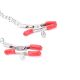 Тройна обица за поставяне на зърната и други части на тялото без пробиване на дупка. Щипки със силикон и ограничител. Обща дължина: 85 сантиметра. Размер на щипките: 6 сантиметра. Диаметър на пръстена: 4 сантиметра. Цвят: червен.