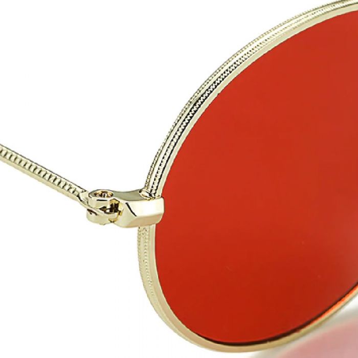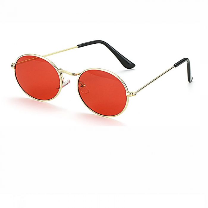 Тънка метална рамка с разширяване зад ушите. Златни рамки с червени стъкла. Разстояние за предната част: 13.5 сантиметра. Диаметър на стъклата: 3.5 - 5 сантиметра. Разстояние за носа: 2 сантиметра. Дължина на страничните рамки: 13.7 сантиметра. Очила с градиентни лещи блокиращи на 100% вредни UV лъчи.