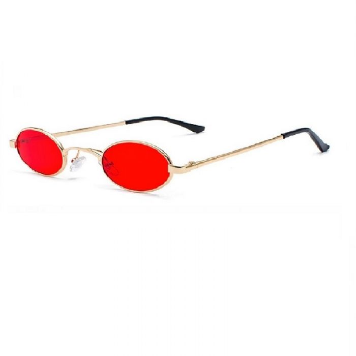Тънка метална рамка с разширяване зад ушите. Златни рамки с червени стъкла. Градиентните лещи блокират на 100% UV лъчи. Размер на стъклата: 3.2 - 4.2 сантиметра. Размер за страничните рамки: 14.3 сантиметра. Размер на предната част: 13 сантиметра. Унисекс очила.