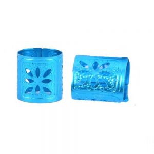 Релефни, широки пръстени за плитки с прорези. Пръстени за африкански плитки. Цена за: 10 броя. Цвят: тюркоаз. Диаметър: 10 милиметра с възможност за разширяване и свиване. Височина: 10 милиметра. Материал: алуминий.
