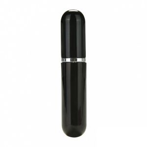 Флакон за парфюм. Спрей шишета за есенции. Аксесоар за дамска чанта. Цвят: черен. Ефектен пръстен под капачката, полирана повърхност. За многократна употреба, след обилно измиване с гореща вода. Вместимост: 5 милилитра. Височина: 8.2 сантиметра. Диаметър: 1.85 сантиметра.