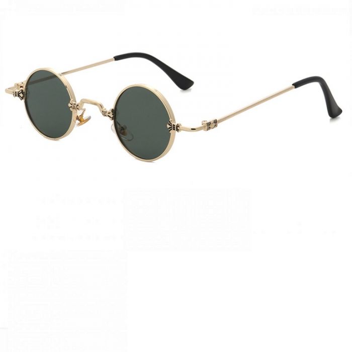 Унисекс слънчеви очила с поляризирани лещи намаляващи умората на очите. Ефектни метални декорации за страничните рамки. Пънк очила с малки раздалечени стъкла. Anti-UV предпазване от ултравиолетовите лъчи, защита UV 400. Размер за лицето: 13.5 сантиметра. Размер за страничните рамки: 14.5 сантиметра. Разстояние между стъклата: 3 сантиметра. Диаметър на стъклата: 3.8 сантиметра. Цвят на рамките: златен. Цвят на стъклата: маслено зелен. Подходящи за всяка форма лице. Неутрализиране на синята вредна светлина до 400nm. Блокиране на 100% UVA, UVB, UVC лъчи - UV защита. Очила с поляризирани стъкла с висока разделителна способност.