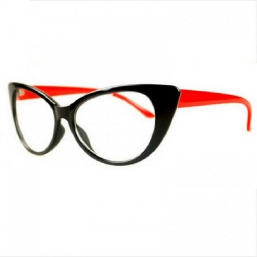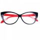 Пластмасови рамки в заоблена извита форма. Рамки за очила за поставяне на диоптрични стъкла. Дамски очила стил котешко око. Цвят: червено черен. Дължина на предна рамка: 14 сантиметра. Дължина на странична рамка: 13.3 сантиметра. Размер само на отвора хоризонтал и вертикал в най-дългата му част: 4.2 - 5.5 сантиметра. Разстояние за носа: 2 сантиметра. Рамки за поставяне на стъкла до 2.5 диоптъра.