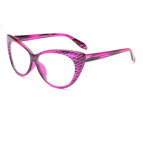 Пластмасови рамки в заоблена извита форма. Рамки за очила за поставяне на диоптрични стъкла. Дамски очила стил котешко око. Цвят: лилав с черни линии. Дължина на предна рамка: 14 сантиметра. Дължина на странична рамка: 13.3 сантиметра. Размер само на отвора хоризонтал и вертикал в най-дългата му част: 4.2 - 5.5 сантиметра. Разстояние за носа: 2 сантиметра. Рамки за поставяне на стъкла до 2.5 диоптъра.