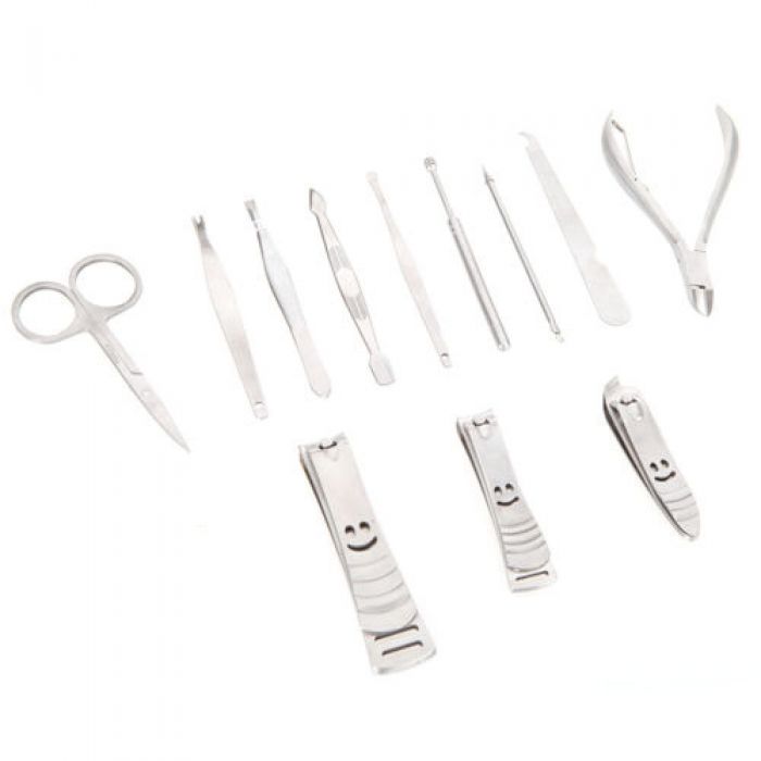 Материал на несесера – изкуствена кожа. 12 основни части за маникюр, педикюр и козметични пинцети:
